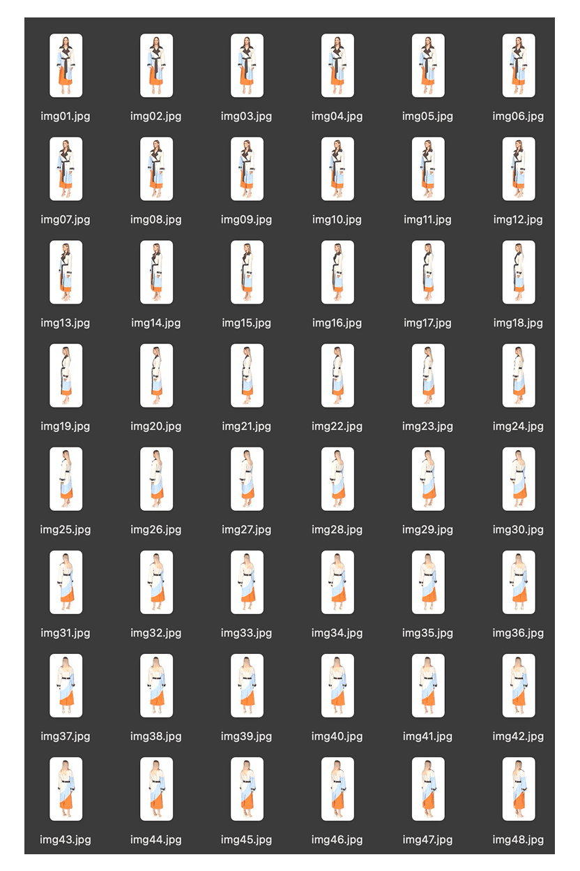360 çekim ürünün 1'dk içerisinde çekilen 72 fotoğraftan oluşur. Bu fotoğraflardan ise e-ticaret sitenizde kullanabileceğiniz interaktif 360, 72 fotoğraftan çıkarılan ön/arka/sağ/sol pozlar, fotoğraflardan oluşan 360 video/GIF ve detay çekim elde edilir.